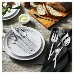 - Set includes 8 x 5-piece place settings. 5-piece setting includes dinner fork, salad fork, soup spoon, teaspoon, and dinner knife. Serving pieces include serving spoon and fork, slotted spoon, butter knife, and sugar spoon.