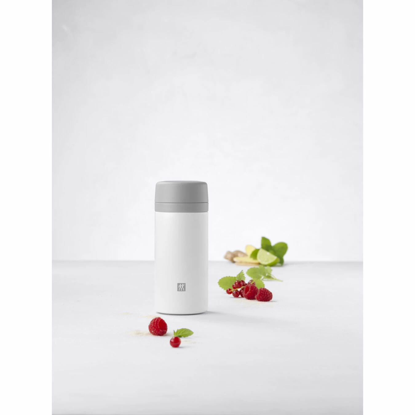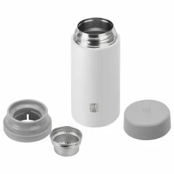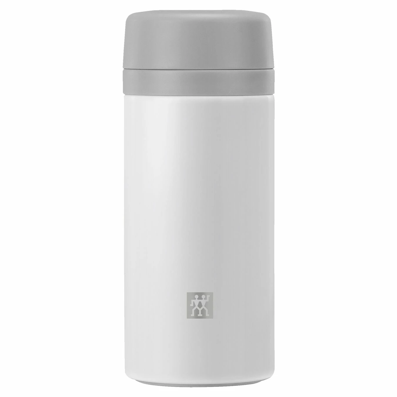 The Thermo Tea & Fruit Infuser Bottle is designed to hold flavored waters, teas, and other beverages that are infused or steeped. An integrated filter keeps tea leaves, steeping herbs, and infusing fruit out of the pouring area so you achieve maximum flavor with no residue in your drink. And the filter is removable for easy clean up, especially when tossed in the dishwasher. Hot beverages stay hot for up to 7 hours and cold beverages remain cold for up to 10 hours. Available in silver-white and black matte, this attractive bottle is a stylish way to take infused and steeped drinks on the go.